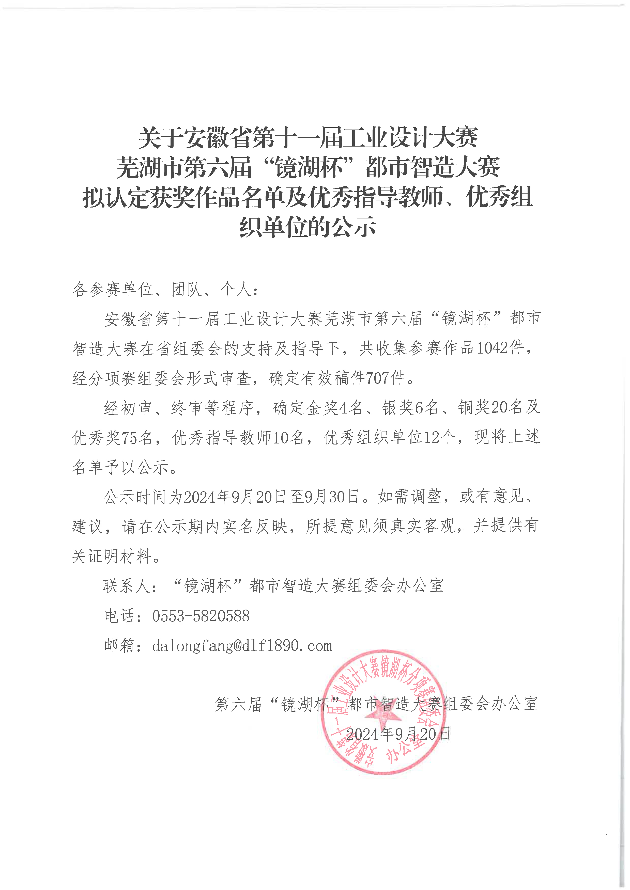 關于安徽省第十一屆工業設計大賽 蕪湖市第六屆“鏡湖杯”都市智造大賽 擬認定獲獎作品名單及優秀指導教師、優秀組織單位的公示